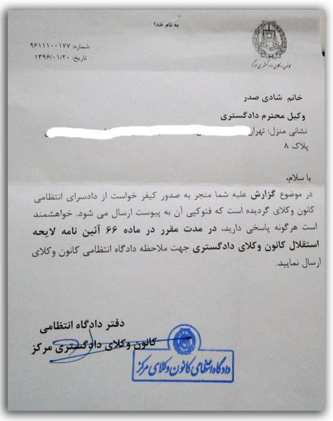 در حالیکه شادی صدر وکیل پایه یک دادگستری مرکز از سالها قبل به علت فعالیتهای مدنی ناگزیر از اقامت در خارج از ایران است، کانون وکلای مرکز به جای حمایت از نامبرده در اقدامی غیر منتظره وی را در شعبه اول دادگاه انتظامی وکلا محاکمه کرده و حسب اطلاعات واصله دادرسی انجام گرفته برخلاف موازین حقوقی مربوطه بوده است . چنین رویهای یاد آور محاکمات فرمایشی دادگاههای انقلاب است که ما وکلای دادگستری بارها شاهد بودیم حکم به وسیله مأمورین امنیتی دیکته شده و وظیفه رئیس دادگاه فقط امضا و اعلام آن است.