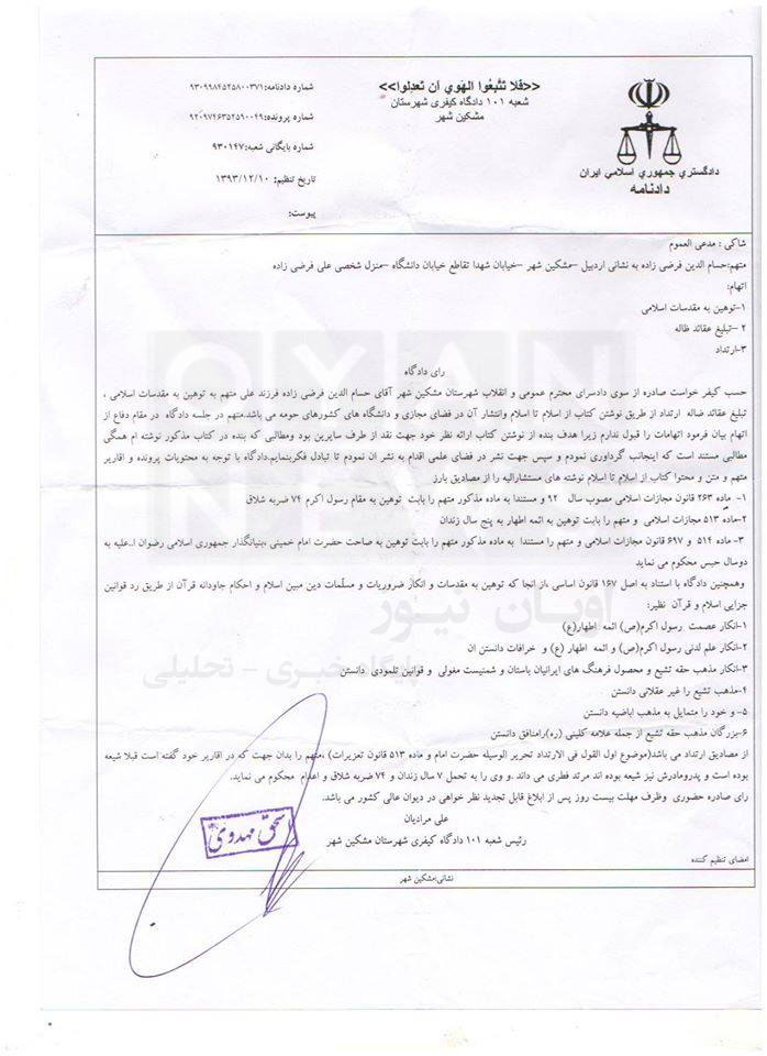 اویان نیوز: حسام الدین فرضی زاده نویسنده [یک کتاب دینی] در مشکین شهر، طبق حکم صادره از سوی شعبه ۱۰۱ دادگاه کیفری مشکین شهر، به اتهام «توهین به مقدسات اسلامی»، «تبلیغ عقاید ضاله» و «ارتداد» به ۷سال زندان، ۷۴ ضربه شلاق و اعدام محکوم شد.حسام الدین فرضی زاده نویسنده کتاب «از اسلام تا اسلام» است. بر اساس برخی گزارشات، این کتاب در مصر و کانادا با مقدمه «شیخ عثمان المراکشی» چاپ شده است.